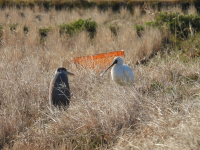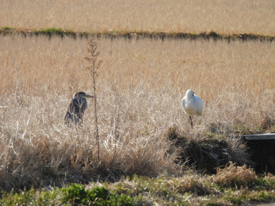 | クロツラヘラサギとアオサギ 何を話しているのかな |