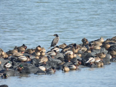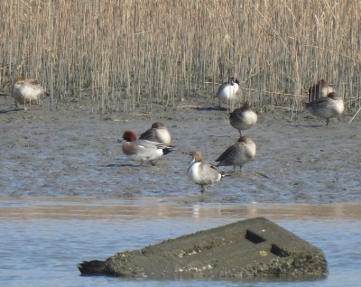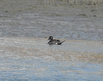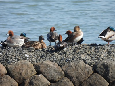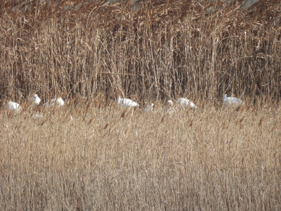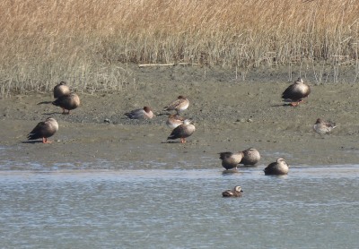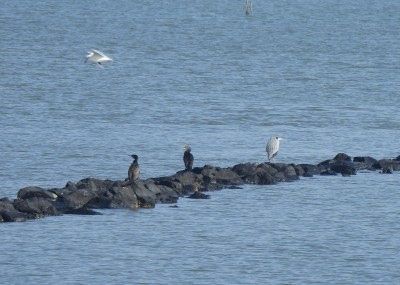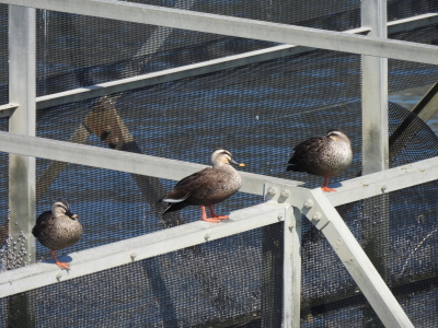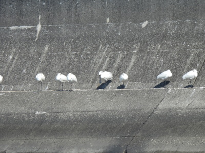 | 探鳥する場所で堤防に クロツラヘラサギが並んでいます 鉄骨の場所にはカルガモが |